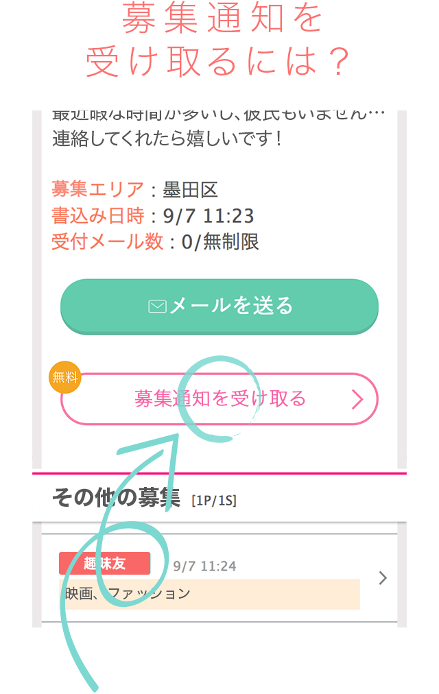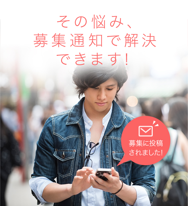 【募集通知】に登録しておくと、気になるお相手の方が募集機能に投稿したときに、メールで通知が受け取れます。